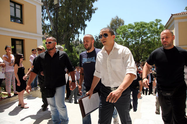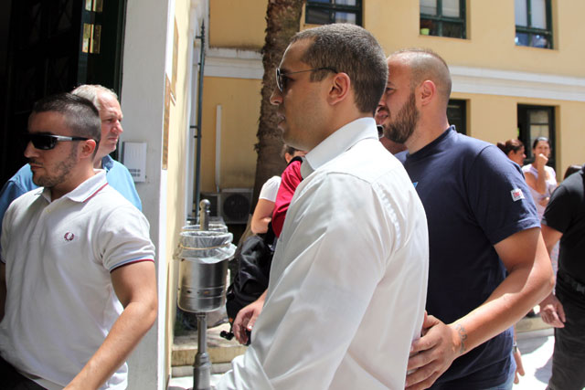 Συνοδεία πέντε μελών της Χρυσής Αυγής κατέφθασε στα δικαστήρια της Ευελπίδων, λίγα λεπτά πριν από τις 12.00 το μεσημέρι, ο εκπρόσωπος του κόμματος Ηλίας Κασιδιάρης.