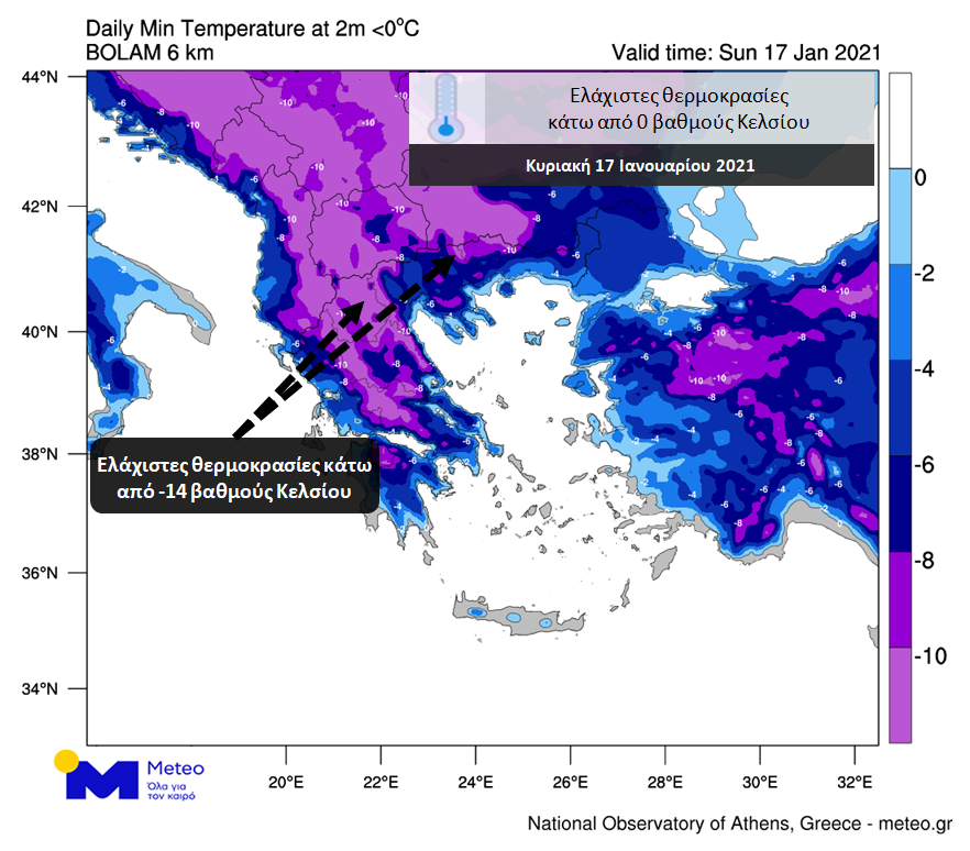 Δριμύ ψύχος αναμένεται να επικρατήσει και σήμερα Κυριακή στη χώρα καθώς η ελάχιστη θερμοκρασία είναι κάτω από τους μηδέν βαθμούς Κελσίου στο σύνολο σχεδόν της ηπειρωτικής χώρας. Ιδιαίτερα στα βόρεια ο υδράργυρος θα πέσει κατά τόπους κάτω από τους -14 βαθμούς Κελσίου. Η κακοκαιρία «Λέανδρος» αναμένεται να συνεχιστεί και τις επόμενες ημέρες, ιδιαίτερα στην Αττική, τη Βοιωτία, την Εύβοια αλλά και την Πελοπόννησο.
