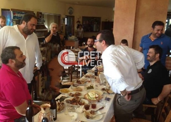 Μαζί στη συντροφιά ο δήμαρχος Ανωγείων Μανόλης Καλέργης, ο Μανόλης Κονταρός, ο δημοσιογράφος Γιάννης Κουρτάκης, το γνωστό τραπεζικό στέλεχος Γιώργος Βρέντζος (ζει στο Μονακό) και άλλα στελέχη της ομάδας καθώς και συνεργάτες του Βαγγέλη Μαρινάκη.