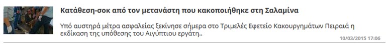 Στις 30 Απριλίου 2015 με τις καταθέσεις μαρτύρων θα συνεχιστεί στο Τριμελές Εφετείο Κακουργημάτων Πειραιά η εκδίκαση της υπόθεσης του Aιγύπτιου εργάτη Ουαλίντ Ταλέμπ που είχε καταγγείλει στην Αστυνομία ότι βασανίστηκε και κακοποιήθηκε από τον εργοδότη του και τον γιο του στη Σαλαμίνα το καλοκαίρι του 2012. Για την ίδια υπόθεση κατηγορούνται δύο ακόμη άτομα.