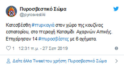 Στο σημείο έσπευσαν έξι οχήματα της Πυροσβεστικής με 14 πυροσβέστες, οι οποίοι κατάφεραν να σβήσουν τη φωτιά στο εστιατόριο, στο οποίο προκλήθηκαν ωστόσο μεγάλες υλικές ζημιές.