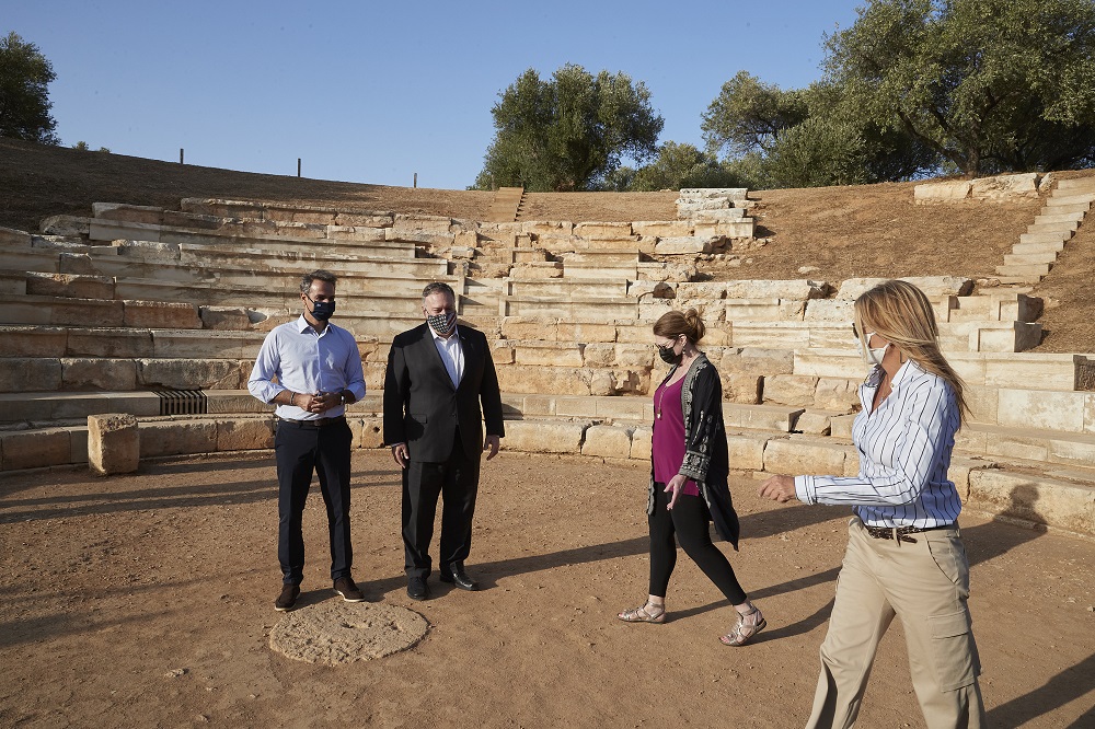 Οι κ. Μητσοτάκης και Πομπέο, στάθηκαν στη θυμέλη, στο κέντρο της ορχήστρας του θεάτρου, ενώ είχαν την ευκαιρία να επιβεβαιώσουν και την εξαιρετική ακουστική του.