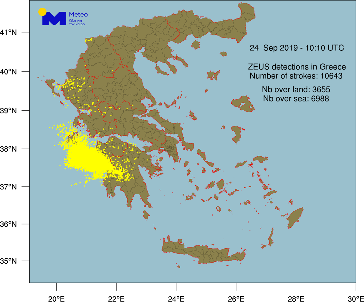 Το σύστημα καταγραφής κεραυνών «ΖΕΥΣ» του Εθνικού Αστεροσκοπείου Αθηνών κατέγραψε περισσότερους από 10.500 κεραυνούς έως τις 13.00, εκ των οποίων περίπου 7.000 πάνω από τη θάλασσα και 3.500 πάνω από την ξηρά. Στον χάρτη που ακολουθεί παρουσιάζεται η γεωγραφική κατανομή.