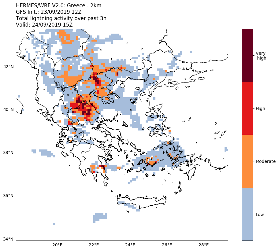 Σημειώνεται πως εκατοντάδες κεραυνοί έπληξαν τη δυτική Πελοπόννησο. Στον παρακάτω χάρτη παρουσιάζεται η αναμενόμενη ηλεκτρική δραστηριότητα στην ατμόσφαιρα (κεραυνοί) το απόγευμα της Τρίτης.