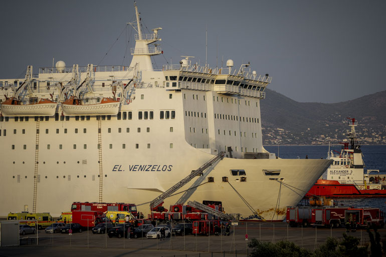 Το «Ελευθέριος Βενιζέλος» έχει πάρει κλίση στο λιμάνι, λόγω της συσσώρευσης υδάτων από την πυροσβεστική επιχείρηση, εντός του γκαράζ του πλοίου. Οι λιμενικές αρχές εκτιμούν ότι μόλις ολοκληρωθεί η επιχείρηση και υποχωρήσουν τα νερά που έριξε η Πυροσβεστική, η κλίση του πλοίου θα επανέλθει χωρίς πρόβλημα.