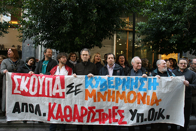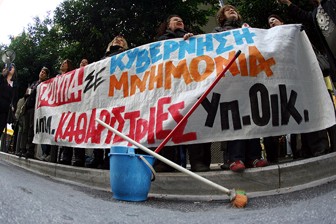 Οι καθαρίστριες κρατούν πανό έξω από το κτίριο του υπουργείου στο οποίο αναγράφεται «Σκούπα σε κυβέρνηση και μνημόνιο» και φωνάζουν συνθήματα.