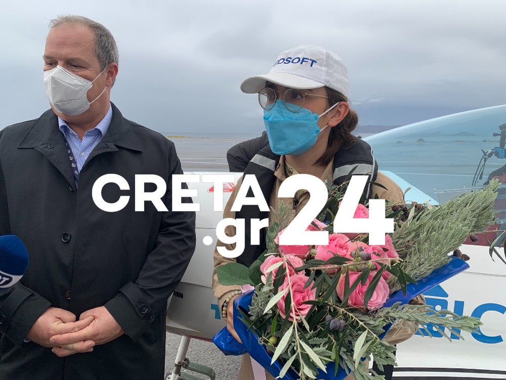 Την νεαρή κοπέλα υποδέχθηκε ο Αερολιμενάρχης Ηρακλείου Γιώργος Πλιάκας ο οποίος της προσέφερε λουλούδια και τη συνεχάρηγια την προσπάθειά της.