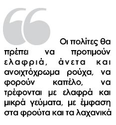 Οι πολίτες θα πρέπει να προτιμούν ελαφριά, άνετα και ανοιχτόχρωμα ρούχα, να φορούν καπέλο, να τρέφονται με ελαφρά και μικρά γεύματα, με έμφαση στα φρούτα και τα λαχανικά, να πίνουν άφθονα υγρά και να αποφεύγουν τα οινοπνευματώδη ποτά.