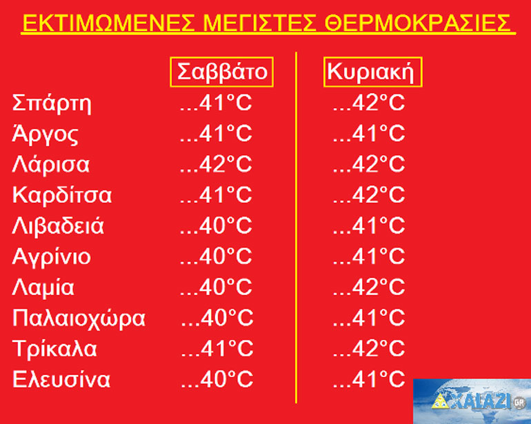 Συγκεκριμένα τα θερμόμετρα έδειξαν: Σπάρτη 40.6 βαθμούς, Θήβα 40.3 βαθμούς και Λιβαδειά 40 βαθμούς Κελσίου.