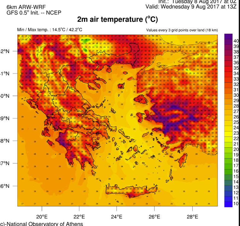 Η θερμοκρασία την Τρίτη θα κυμανθεί από 25 έως 40 βαθμούς στη Β. Ελλάδα, από 27 έως 38 βαθμούς στην κεντρική και νότια Ελλάδα, από 24 έως 39 βαθμούς στη δυτική Ελλάδα, από 27 έως 34 βαθμούς στις Κυκλάδες και στην Κρήτη (στη νότια Κρήτη η μέγιστη θα φτάσει τους 36 βαθμούς), από 4 έως 36 βαθμούς στα νησιά του ανατολικού Αιγαίου και τα Δωδεκάνησα.