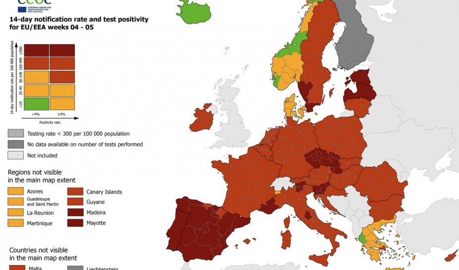 Αναφορικά με τον δείκτη θετικότητας η Ελλάδα παραμένει στο «πράσινο», δηλαδή κάτω από 4%, με τις περισσότερες χώρες της Ευρώπης να βρίσκονται στο «κίτρινο».