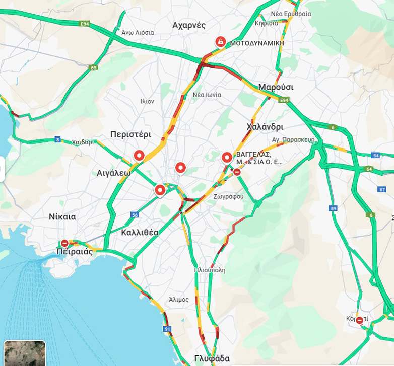 Ειδικά στην Αττική Οδό παρατηρούνται καθυστερήσεις στο ρεύμα προς Αεροδρόμιο (20’-25’), από τον κόμβο της Μεταμόρφωσης έως τον κόμβο της Πεντέλης.