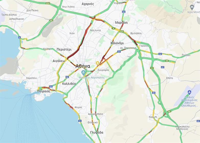 - Στην Αττική Οδό στο ρεύμα προς Αεροδρόμιο με καθυστερήσεις 10′-15′ από κόμβο Μεταμόρφωσης έως κόμβο Κηφισίας.