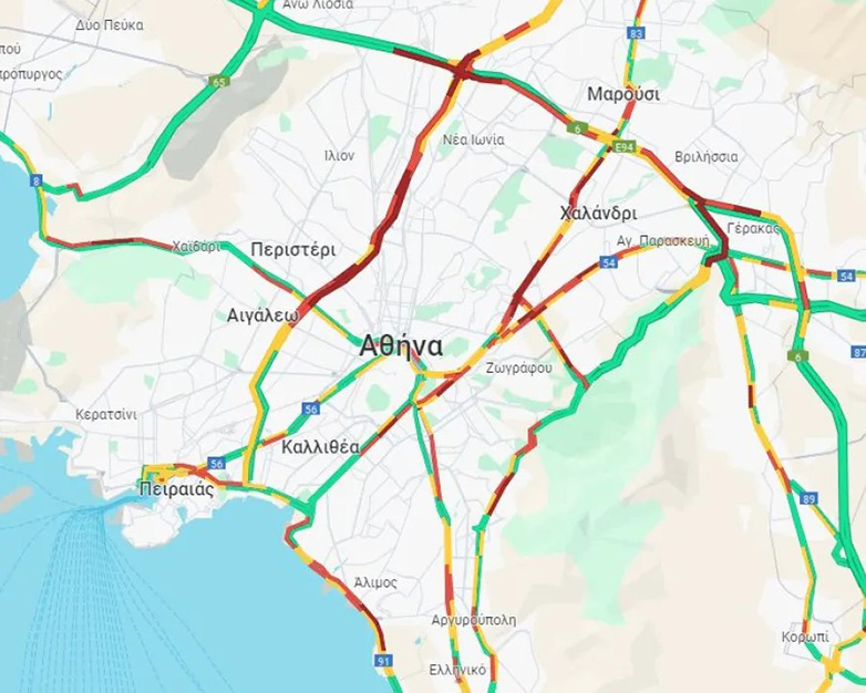 Πολύ αυξημένη είναι η κίνηση και στην κάθοδο της Κηφισίας μετά τον κόμβο της Αττικής οδού, αλλά και στη Μεσογείων προς το κέντρο της Αθηνάς.