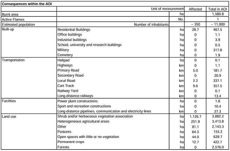 Σύμφωνα με το υπουργείο, η πληγείσα περιοχή ανέρχεται σε 15.808 στρέμματα, εκ των οποίων 11.267 στρέμματα ήταν χορτολιβαδικές και θαμνώδεις εκτάσεις, 2.519 στρέμματα ήταν ετερογενείς/γεωργικές εκτάσεις, 811 στρέμματα προορίζονταν για άλλες χρήσεις, 643 στρέμματα ήταν βοσκότοποι, 440 στρέμματα θεωρούνταν ανοικτοί χώροι με ελάχιστη βλάστηση και 127 στρέμματα ήταν καλλιέργειες.