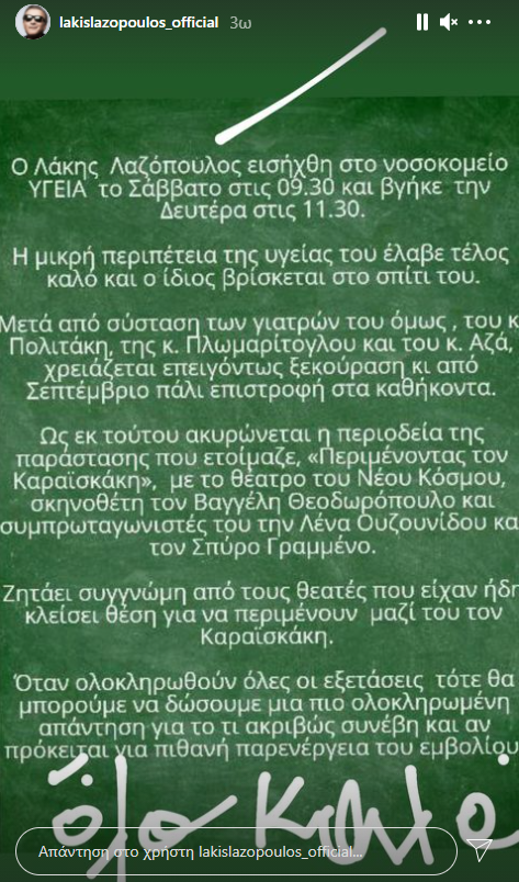 Δείτε την ανακοίνωση στον επίσημο λογαριασμό του Λάκη Λαζόπουλου στο Instagram: