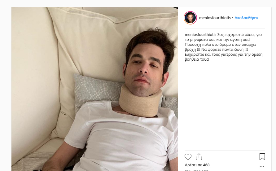 Λίγο μετά, ο Μένιος Φουρθιώτης δημοσίευσε στον προσωπικό του λογαριασμό στο Instagram μια φωτογραφία μέσα από το νοσοκομείο, με την εξής λεζάντα: «Σας ευχαριστώ όλους για τα μηνύματά σας και την αγάπη σας! Προσοχή πολύ στο δρόμο όταν υπάρχει βροχή !!! Να φοράτε πάντα ζώνη !!! Ευχαριστώ και τους γιατρούς για την άμεση βοήθεια τους!».