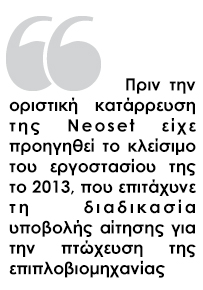 Σύμφωνα με τα όσα κοινοποιούνται στην απόφαση πτώχευσης της Neoset, η επιπλοβιομηχανία είχε σταματήσει να ικανοποιεί τις υποχρεώσεις της προς εργαζομένους, πιστωτές και προμηθευτές, ενώ το εργοστάσιό της κατασχέθηκε πριν από έναν χρόνο.