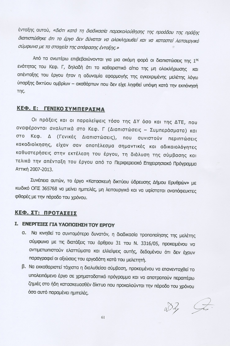 Στην έκθεση ελέγχου η οποία συντάχθηκε και κοινοποιήθηκε στον Εισαγγελέα Πρωτοδικών Αθηνών και τον Περιφερειάρχη Αττικής αναφέρεται μεταξύ άλλων ότι εξαιτίας πράξεις και παραλήψεις υπαλλήλων της Περιφέρειας Αττικής σημειώθηκαν αδικαιολόγητες καθυστερήσεις στην εκτέλεση του έργου, διαλύθηκε η σύμβαση και τελικά «αποβλήθηκε» το έργο από το Περιφερειακό Επιχειρησιακό Πρόγραμμα «Αττική 2007- 2013». Στην ίδια έκθεση γίνεται λόγος για προφανή βλάβη των συμφερόντων του Δημοσίου.