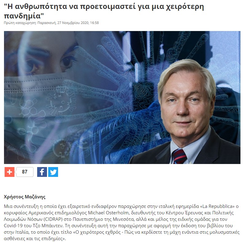 Διαβάστε επίσης τι αποκαλύπτει σε συνέντευξή του στην εφημερίδα “La Repubblica” o επιδημιολόγος του Τζο Μπάιντεν Michael Osterholm: