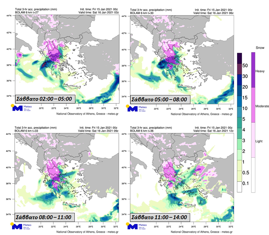 Εν τω μεταξύ, ισχυρές θα είναι οι βροχοπτώσεις σε Νότιο Ιόνιο, Κεφαλονιά και Ιθάκη. Τα φαινόμενα θα εξασθενήσουν σταδιακά από το βράδυ του Σαββάτου 16/1 και από το πρωί της Κυριακής 17/1 θα περιοριστούν κατά κύριο λόγο στο Αιγαίο. Στους χάρτες που ακολουθούν παρουσιάζεται ο ολικός υετός (βροχή/χιόνι) που αναμένεται από τις πρώτες ώρες έως το μεσημέρι του Σαββάτου 16/1. Με πράσινες αποχρώσεις παρουσιάζεται το ύψος της βροχόπτωσης και με μοβ αποχρώσεις παρουσιάζεται η ένταση της χιονόπτωσης.