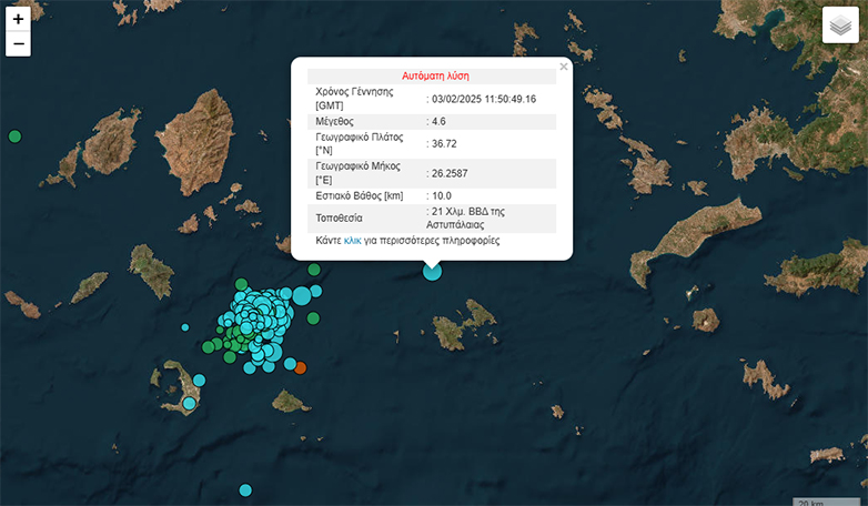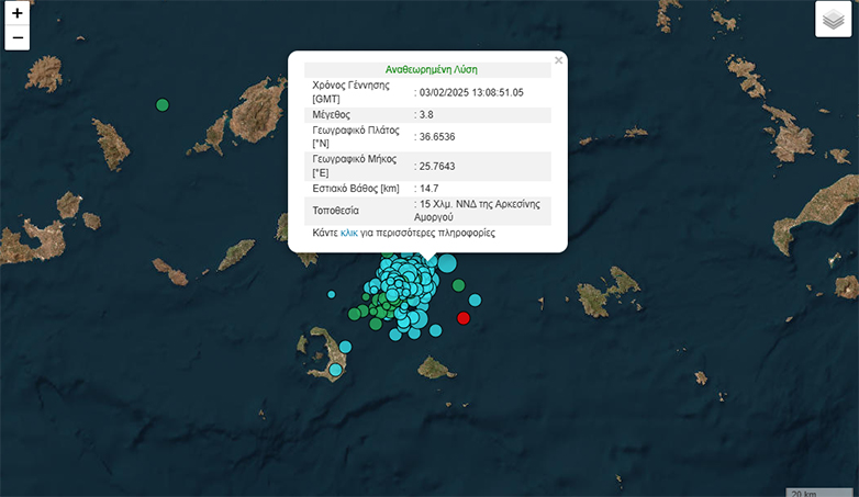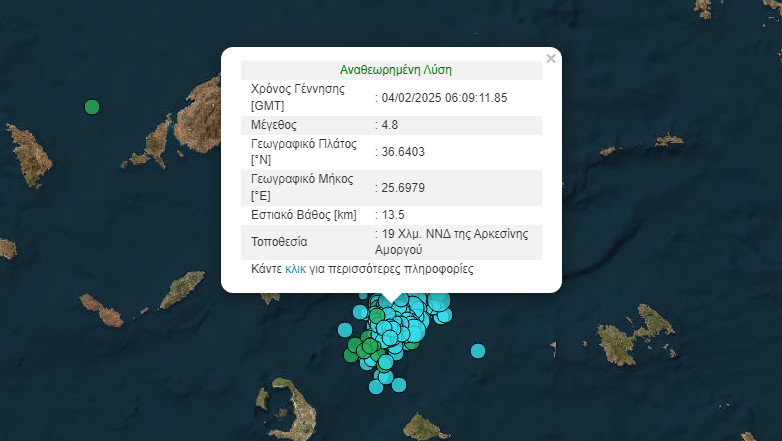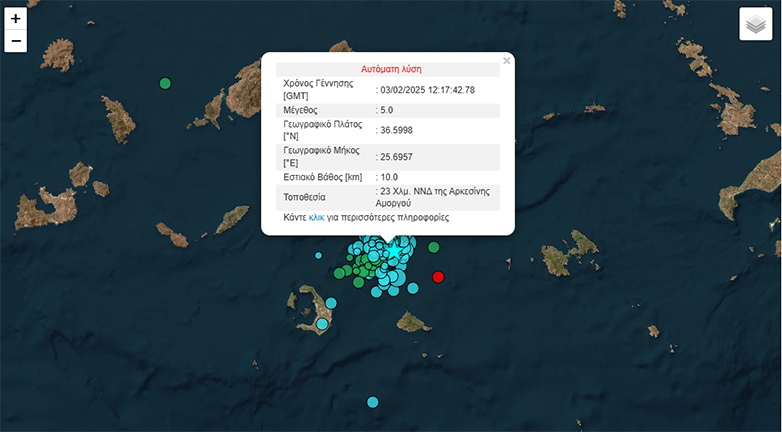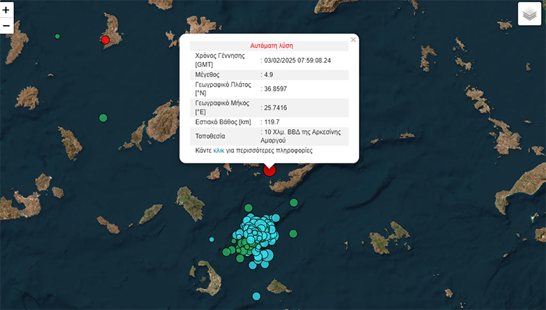 Στις 09:19 πμ. της Τρίτης (4/2) σημειώθηκε νέος σεισμός μεγέθους 3,7 βαθμών της κλίμακας Ρίχτερ, 23 χιλιόμετρα νοτιοδυτικά της Αρκεσίνης Αμοργού, με εστιακό βάθος 5 χιλιόμετρα