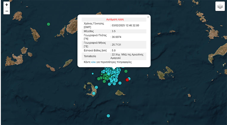 Στις 09:19 πμ. της Τρίτης (4/2) σημειώθηκε νέος σεισμός μεγέθους 3,5 βαθμών της κλίμακας Ρίχτερ, 22 χιλιόμετρα νοτιοδυτικά της Αρκεσίνης Αμοργού, με εστιακό βάθος 10 χιλιόμετρα