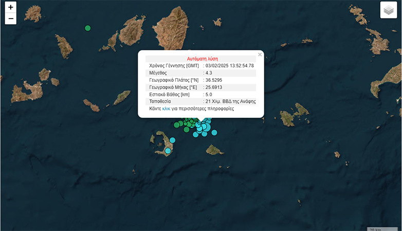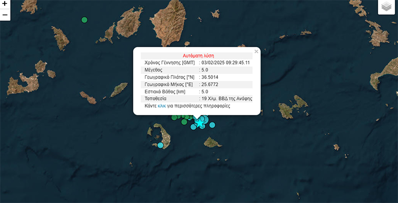 Θυμίζουμε ότι από την 24η Ιανουαρίου, στη θαλάσσια περιοχή της Ανύδρου, μεταξύ Σαντορίνης και Αμοργού, έχουν καταγραφτεί πάνω από 380 σεισμοί.