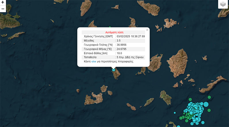 Μια ακόμη δόνηση, αυτή τη φορά 5 χιλιόμετρα βόρεια-βορειοδυτικά της Σίφνουκαι με ένταση 3,5 ρίχτερ σημειώθηκε στις 12:36.