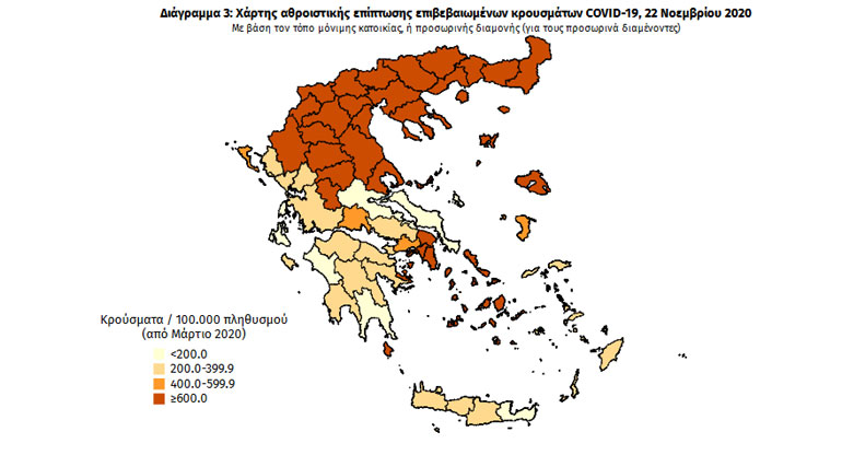 Ο χάρτης αποτυπώνει τη γεωγραφική κατανομή των συνολικών κρουσμάτων COVID-19 (από την αρχή της επιδημίας) ανά Περιφερειακή Ενότητα της χώρας, με βάση την δηλωθείσα διεύθυνση μόνιμης κατοικίας του ασθενούς, ή τη διεύθυνση προσωρινής διαμονής για τους τουρίστες και άλλους προσωρινά διαμένοντες στην Ελλάδα. Συμπεριλαμβάνονται τόσο κρούσματα με ιστορικό ταξιδίου (“εισαγόμενα”) όσο και κρούσματα με πιθανή εγχώρια μετάδοση.