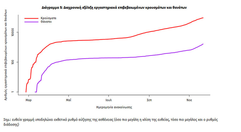 Η διαχρονική εξέλιξη των συνολικών κρουσμάτων και συνολικού αριθμού των θανάτων ασθενών COVID-19 παρουσιάζεται στοακόλουθο διάγραμμα (σε λογαριθμική κλίμακα).