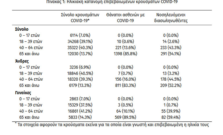 Η μέση ηλικία των κρουσμάτων είναι 42 έτη (εύρος 0 έως 104 ετών), ενώ η μέση ηλικία των θανάτων είναι 80 έτη (εύρος 25 έως 103ετών). Η ηλικιακή κατανομή των (α) συνολικών κρουσμάτων, (β) των περιστατικών που κατέληξαν σε θάνατο και (γ) των ασθενώνπου νοσηλεύονται διασωληνωμένοι, είναι η ακόλουθη: