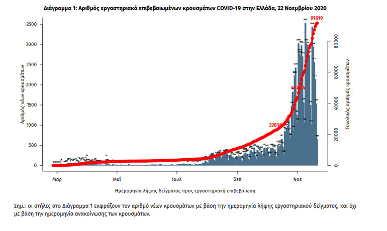 Τα στοιχεία που παρουσιάζονται αφορούν περιστατικά από την επιδημιολογική επιτήρηση της νόσου από το νέο κορωνοϊό (COVID-19), με βάση τα δεδομένα που έχουν δηλωθεί στον ΕΟΔΥ και καταγραφεί μέχρι τις 22 Νοεμβρίου 2020 (ώρα 15:00).Τα νέα εργαστηριακά επιβεβαιωμένα κρούσματα της νόσου είναι 1.498, εκ των οποίων 22 εντοπίστηκαν κατόπιν ελέγχων στις πύλες εισόδου της χώρας. Ο συνολικός αριθμός των κρουσμάτων ανέρχεται σε91619(ημερήσια μεταβολή +1.7%), εκ των οποίων 53.4%άνδρες.