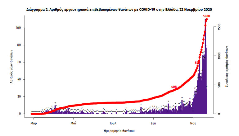 Οι νέοι θάνατοι ασθενών με COVID-19 είναι103, ενώ από την έναρξη της επιδημίας έχουν καταγραφεί συνολικά1630 θάνατοι. Η διάμεση ηλικία των ασθενών που απεβίωσαν είναι80έτη. Ο αριθμός των ασθενών που νοσηλεύονται διασωληνωμένοι είναι 540(72.2% άνδρες).Η ημερήσια κατανομή των επιβεβαιωμένων κρουσμάτων είναι η ακόλουθη (η γραμμή παριστάνει την συνολική, αθροιστική κατανομή των κρουσμάτων).