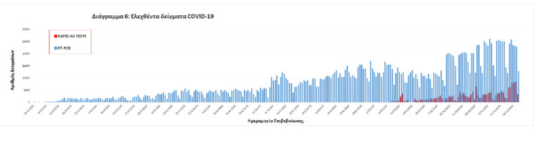 Δείγματα που έχουν ελεγχθεί: Από την 1η Ιανουαρίου 2020 μέχρι σήμερα, στα εργαστήρια που διενεργούν ελέγχους για τον νέο κορωνοϊό (SARS-CoV-2) και που δηλώνουν συστηματικά στον ΕΟΔΥ το σύνολο των δειγμάτων που ελέγχουν, έχουν συνολικά ελεγχθεί 2.235.923 κλινικά δείγματα ενώ από Μονάδες Υγείας και Κλιμάκια του ΕΟΔΥ που διενεργούν ελέγχους Rapid έχουν ελεγχθεί 1.524.64 δείγματα.