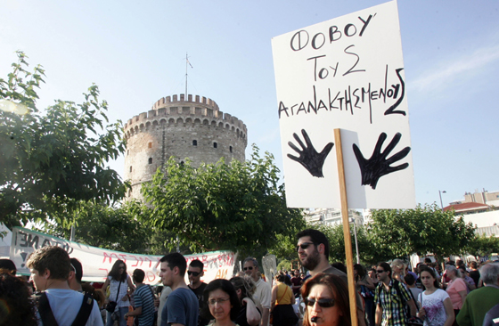 Οι «Αγανακτισμένοι» της Θεσσαλονίκης πραγματοποίησαν πορεία το απόγευμα, ενώ καλούν όλο τον κόσμο σε μποϊκοτάζ αγορών την Τέταρτη, 15 Ιουνίου, ημέρα της πανεργατικής απεργίας.