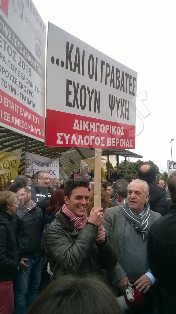 Οι δικηγόροι κατευθύνθηκαν προς το δημαρχείο της πόλης, ενώ, όπως φαίνεται και στη φωτογραφία, σε ένα πανό γράφουν: «Και οι γραβάτες έχουν ψυχή».