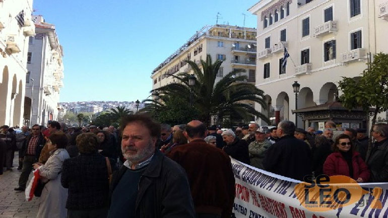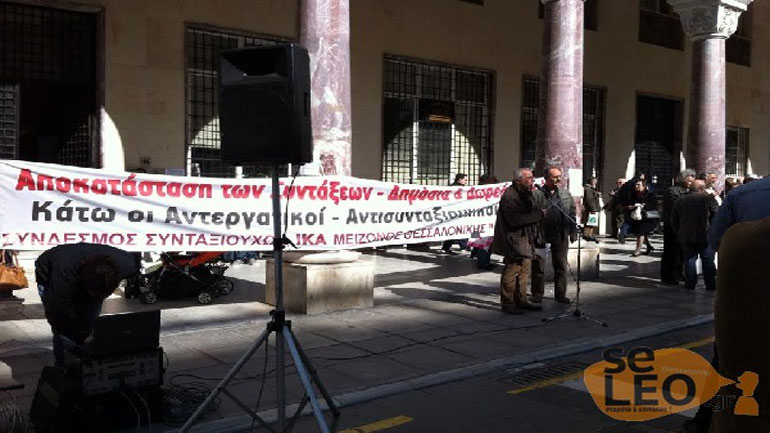 Παράσταση διαμαρτυρίας έξω από το ΙΚΑ στην πλατεία Αριστοτέλους, στη Θεσσαλονίκη, πραγματοποίησαν το πρωί της Τετάρτης συνταξιούχοι, στο πλαίσιο πανελλαδικής κινητοποίησης των συνεργαζόμενων ομοσπονδιών συνταξιούχων (ΙΚΑ-ΟΑΕΕ-ΔΗΜΟΣΙΟΥ-ΟΤΑ, πρώην ΔΕΚΟ-Τραπεζών).