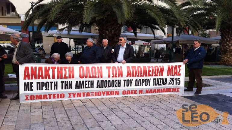 Οι συνταξιούχοι διεκδικούν, εκτός από την «άμεση καταβολή» του δώρου του Πάσχα, «να μην μπει χέρι στα αποθεματικά των ασφαλιστικών ταμείων», να καταργηθούν «όλοι οι αντεργατικοί, αντιασφαλιστικοί, φορομπηχτικοί νόμοι» και να αποκατασταθούν οι περικοπές στις συντάξεις, στην πρόνοια και στην ιατροφαρμακευτική περίθαλψη.