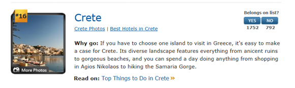 Σύμφωνα με το αμερικανικό travel.usnews που οργανώνει την ψηφοφορία και που τη χαρακτηρίζει ως το νησί που συνδυάζει τα πάντα, η Κρήτη συγκαταλέγεται μεταξύ των 20 ωραιότερων τουριστικών προορισμών του κόσμου. Για την ακρίβεια, φιγουράρει στη 16η θέση, μία θέση κάτω από την 15η Πράγα και μία θέση πάνω από το 17ο Μαϊάμι.