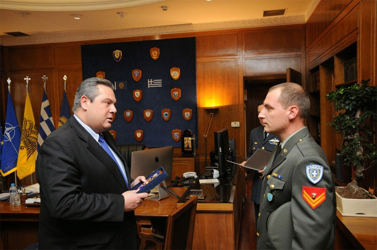 Ο κ. Καμμένος συνεχάρη τον στρατιωτικό για την πράξη του και για το ήθος του, ενώ του παρέδωσε τον Θυρεό του υπουργείου Εθνικής Άμυνας, δίνοντας παράλληλα εντολή να μετατεθεί άμεσα στον τόπο κατοικίας του.