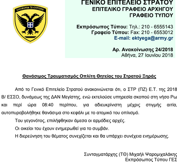 Όπως ανακοινώθηκε από το Γενικό Επιτελείο Στρατού, ο στρατιώτης είχε παρουσιαστεί στη Β/ ΕΣΣΟ, δυνάμεως της ΔΑΝ Μεγίστης, και ενώ εκτελούσε υπηρεσία σκοπού στη νήσο Ρω, περίπου στις 08.40, για αδιευκρίνιστη μέχρις στιγμής αιτία, αυτοπυροβολήθηκε θανάσιμα στο κεφάλι με τον ατομικό του οπλισμό.
