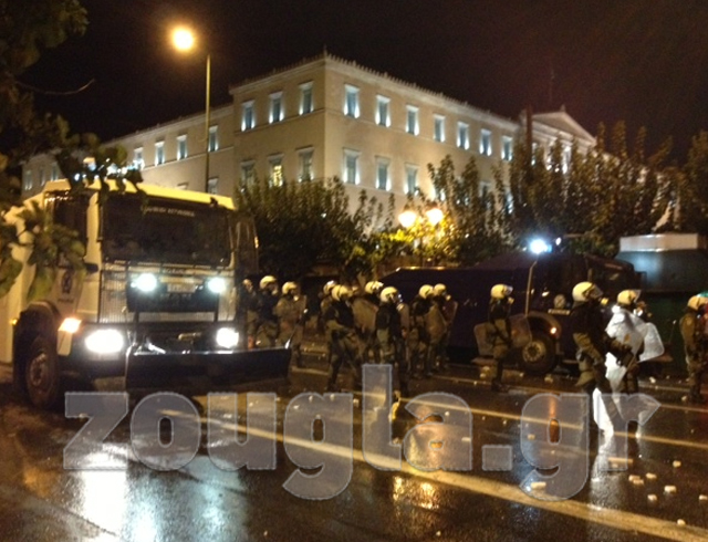 Ισχυρές δυνάμεις των ΜΑΤ συνεπικουρούμενες από μηχανοκίνητα της Αστυνομίας που χρησιμοποιούνται για πρώτη φορά, επιτίθενται εδώ και αρκετή ώρα κατά των διαμαρτυρομένων Ελλήνων πολιτών που συμμετέχουν στο ογκώδες συλλαλητήριο στην Πλατεία Συντάγματος.