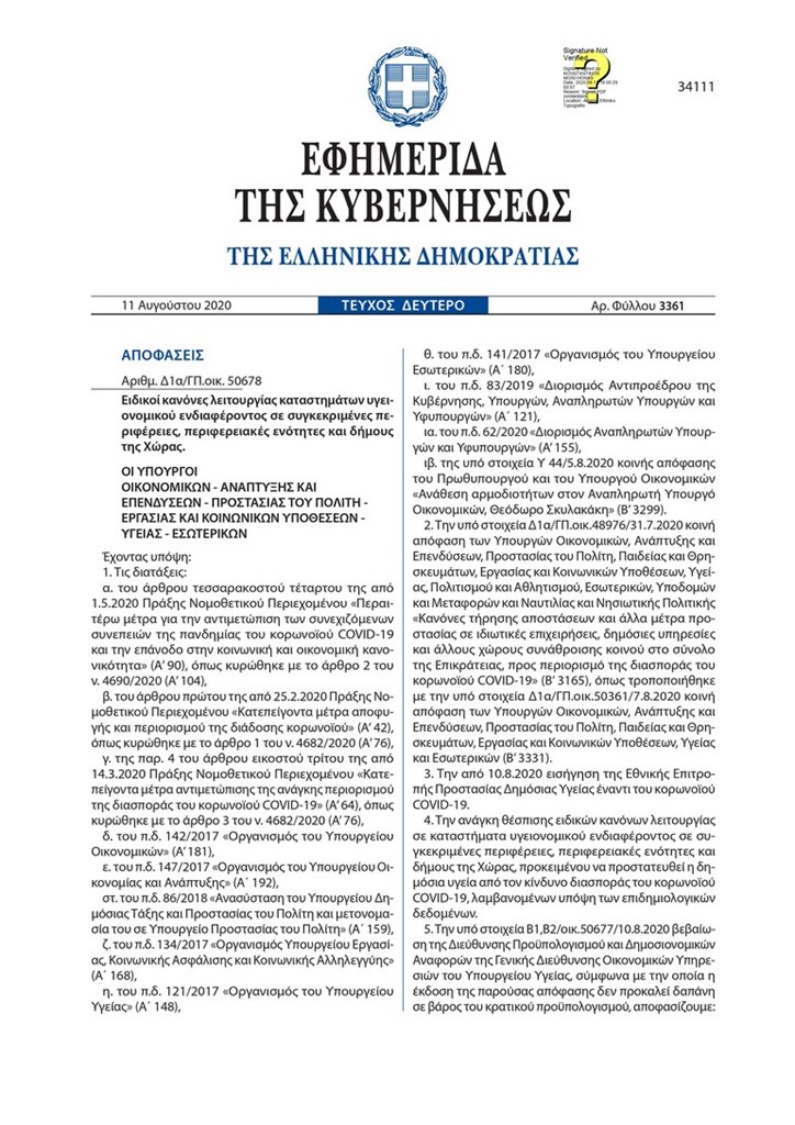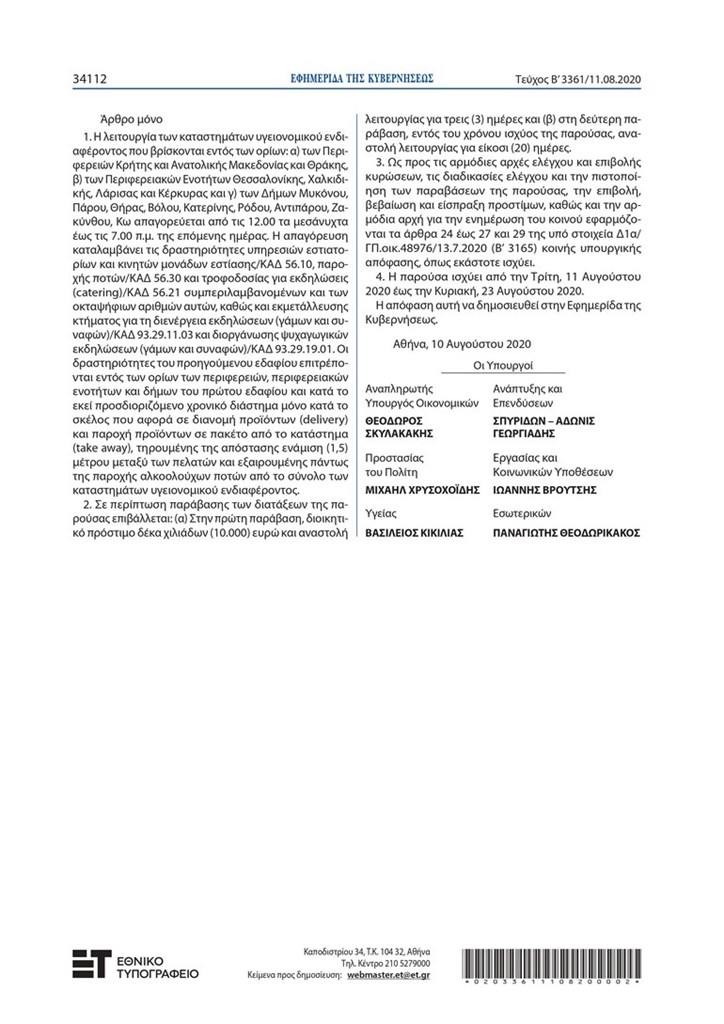 «Η λειτουργία των καταστημάτων υγειονομικού ενδι-αφέροντος που βρίσκονται εντός των ορίων: α) των Περι-φερειών Κρήτης και Ανατολικής Μακεδονίας και Θράκης, β) των Περιφερειακών Ενοτήτων Θεσσαλονίκης, Χαλκιδι-κής, Λάρισας και Κέρκυρας και γ) των Δήμων Μυκόνου, Πάρου, Θήρας, Βόλου, Κατερίνης, Ρόδου, Αντιπάρου, Ζα-κύνθου, Κω απαγορεύεται από τις 12.00 τα μεσάνυχτα έως τις 7.00 π.μ. της επόμενης ημέρας. Η απαγόρευση καταλαμβάνει τις δραστηριότητες υπηρεσιών εστιατο-ρίων και κινητών μονάδων εστίασης/ΚΑΔ 56.10, παρο-χής ποτών/ΚΑΔ 56.30 και τροφοδοσίας για εκδηλώσεις (catering)/ΚΑΔ 56.21 συμπεριλαμβανομένων και των οκταψήφιων αριθμών αυτών, καθώς και εκμετάλλευσης κτήματος για τη διενέργεια εκδηλώσεων (γάμων και συ-ναφών)/ΚΑΔ 93.29.11.03 και διοργάνωσης ψυχαγωγικών εκδηλώσεων (γάμων και συναφών)/ΚΑΔ 93.29.19.01. Οι δραστηριότητες του προηγούμενου εδαφίου επιτρέπο-νται εντός των ορίων των περιφερειών, περιφερειακών ενοτήτων και δήμων του πρώτου εδαφίου και κατά το εκεί προσδιοριζόμενο χρονικό διάστημα μόνο κατά το σκέλος που αφορά σε διανομή προϊόντων (delivery) και παροχή προϊόντων σε πακέτο από το κατάστημα (take away), τηρουμένης της απόστασης ενάμιση (1,5) μέτρου μεταξύ των πελατών και εξαιρουμένης πάντως της παροχής αλκοολούχων ποτών από το σύνολο των καταστημάτων υγειονομικού ενδιαφέροντος.2. Σε περίπτωση παράβασης των διατάξεων της πα-ρούσας επιβάλλεται: (α) Στην πρώτη παράβαση, διοικητι-κό πρόστιμο δέκα χιλιάδων (10.000) ευρώ και αναστολή λειτουργίας για τρεις (3) ημέρες και (β) στη δεύτερη πα-ράβαση, εντός του χρόνου ισχύος της παρούσας, ανα-στολή λειτουργίας για είκοσι (20) ημέρες».