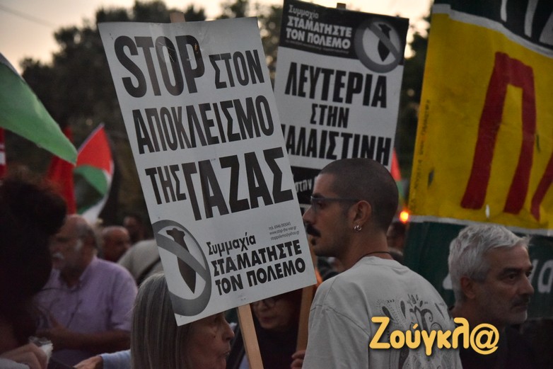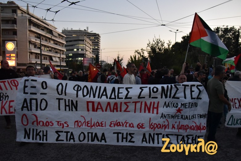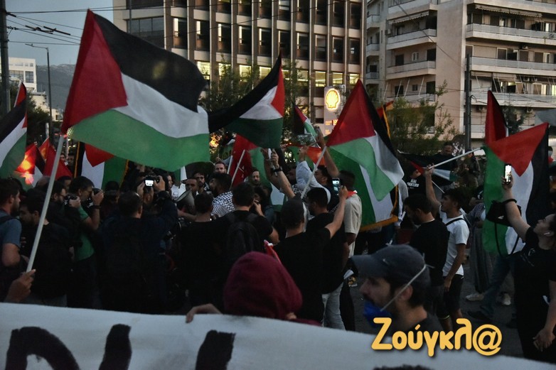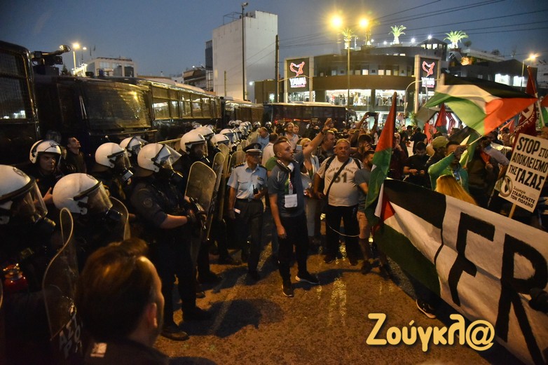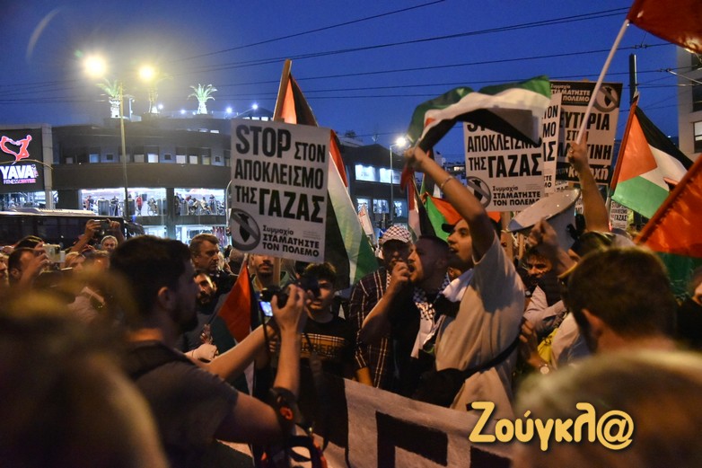 Συγκέντρωση αλληλεγγύης πραγματοποιήθηκε το απόγευμα της Δευτέρας έξω από την πρεσβεία του Ισραήλ, με αποτέλεσμα τη διακοπή κυκλοφορίας των οχημάτων στη συμβολή των λεωφόρων Κατεχάκη και Κηφισίας.