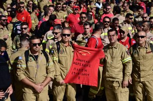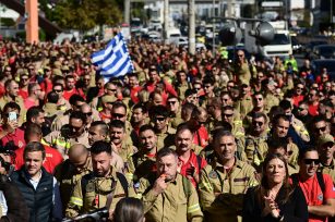 Οι περίπου 2.500 πυροσβέστες που συγκεντρώθηκαν στο σημείο, κρατούν πανό με συνθήματα όπως «οι καταστροφές δεν είναι εποχικές» και ζητούν συνάντηση με τον αρμόδιο υπουργό προκειμένου να του εκφράσουν τα αιτήματά τους.