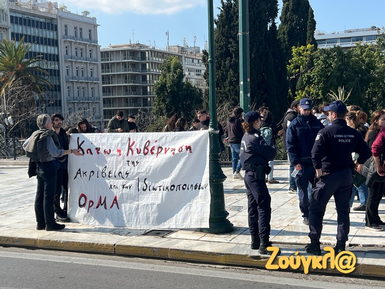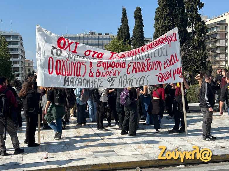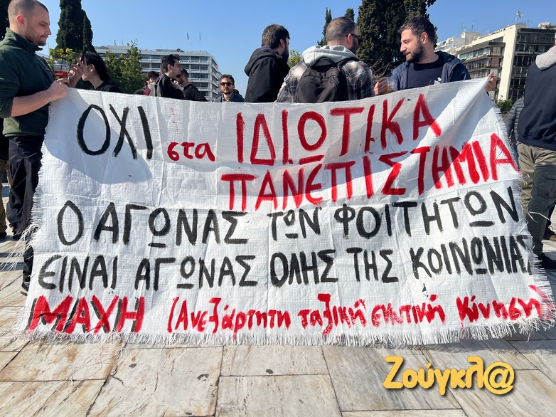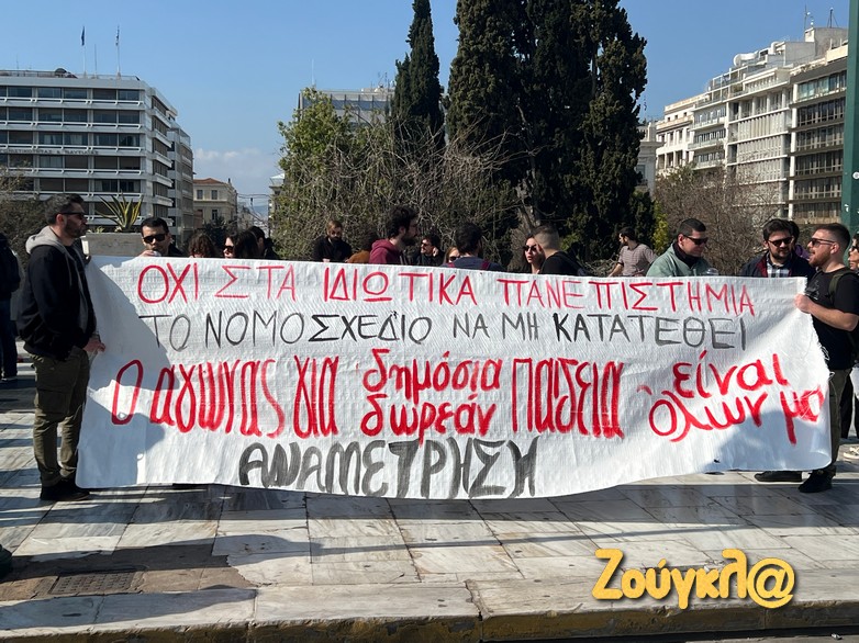 Φοιτητές και εργατικά σωματεία πραγματοποίησαν συγκέντρωση στο Σύνταγμα το μεσημέρι της Κυριακής, 18 Φεβρουαρίου, διαδηλώνοντας κατά των ιδιωτικών πανεπιστημίων.