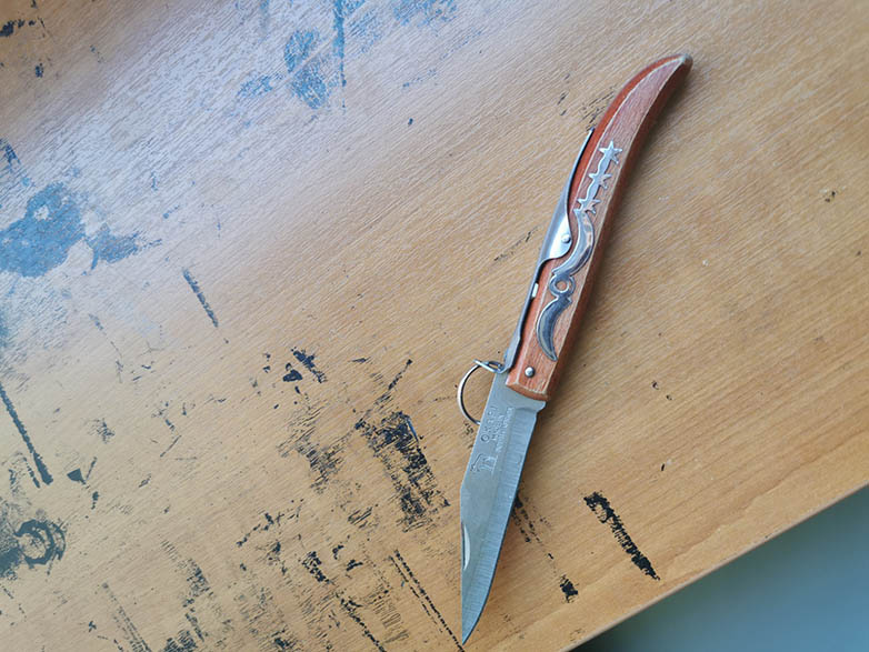 Σε γενόμενο έλεγχο, στην κατοχή του βρέθηκε επιμελώς κρυμμένος εντός του εσωρούχου του αναδιπλούμενος σουγιάς ο οποίος έφερε κηλίδες αίματος.