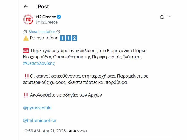 «Πυρκαγιά σε χώρο ανακύκλωσης στο Βιομηχανικό Πάρκο Νεοχωρούδας Ωραιοκάστρου της ΠΕ Θεσσαλονίκης. Οι καπνοί κατευθύνονται στην περιοχή σας. Μείνετε σε εσωτερικούς χώρους. Κλείστε πόρτες και παράθυρα».