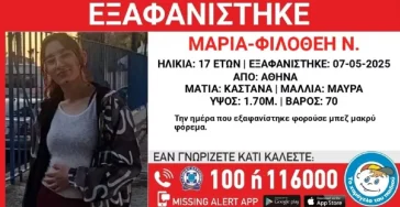 Στις 07/05/25, στις 17:30 το απόγευμα, εξαφανίστηκε από την περιοχή της Αθήνας, η Μαρία – Φιλοθέη, Ν., 17 ετών. Το Χαμόγελο του Παιδιού ενημερώθηκε σήμερα, 12/05/25 και προχώρησε άμεσα στη δημοσιοποίηση των στοιχείων της ανήλικης, κατόπιν Εισαγγελικής Εντολής, καθώς συντρέχουν λόγοι που θέτουν τη ζωή της σε κίνδυνο. Η Μαρία – Φιλοθέη, Ν., 17 ετών, έχει ύψος 1,70 μ., βάρος 70 κιλά, έχει μαύρα μαλλιά και καστανά μάτια. Την ημέρα που εξαφανίστηκε φορούσε μπεζ μακρύ φόρεμα.
